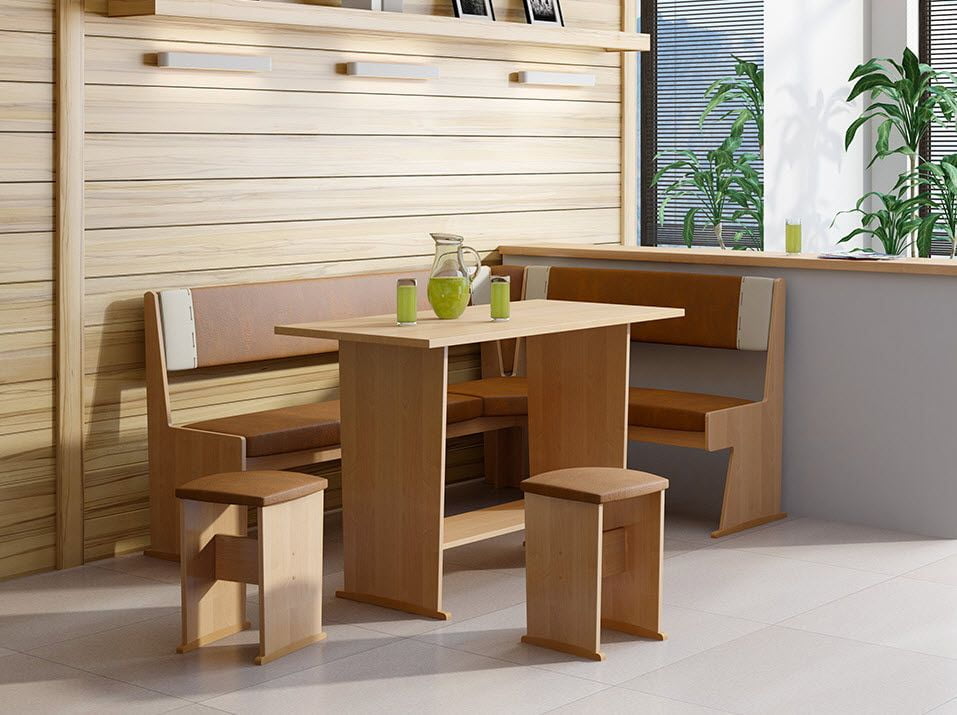 Элегантный удобный обеденный стол, составляющий центральную часть гарнитура, дополняют скамья углового исполнения с высокими спинками и два мягких табурета. Все элементы комплекта выдержаны в едином стилевом решении и цветовой гамме.