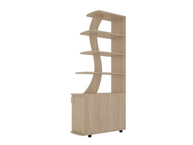 Открытый стеллаж с полками разной длины и шкафчиком в нижней части изделия. Внутри шкафа располагается полка. Стеллаж можно использовать для зонирования пространства. Обратите внимание! Для устойчивости стеллаж рекомендуется крепить к стене (в случае использования стеллажа для зонирования — крепление к стене обязательно). Фурнитура для крепления к стене в комплект стеллажа не входит. Изделие выполнено из ЛДСП толщиной 16 мм. Края отделаны кромкой ПВХ 0,4 мм. Высота тумбы составляет 598 мм. Опоры регулируются от 5 см до 7 см. Расстояние между полками составляет 292 мм.