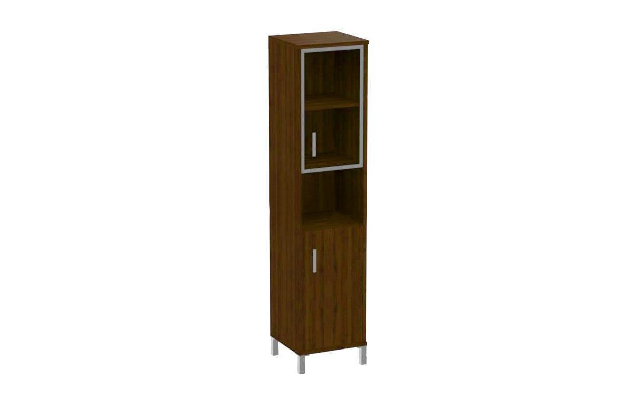 Каркасы шкафов выполнены из ЛДСП толщиной 25мм., кромка ПВХ т. 2мм.  Задняя стенка из ХДФ т.4мм разрезная в паз. Внутренние полки из ЛДСП 18мм., кромка ПВХ т.0,8 мм. ЛДСП т 25мм., кромка ПВХ т. 2 с фасадной стороны, кромка ПВХ т. 0,8 с трех сторон. В упаковке один горизонтальный щит, который можно устанавливать вверху или внизу изделия. Опора регулируемая, цвет алюминий. Стеклянная дверь в алюминиевой рамке, стекло - тонированное пленкой, бронза. Ручка скоба, цвет алюминий. Двери вкладные.