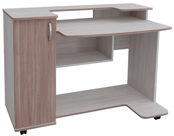 Компьютерный стол с двухуровневой столешницей позволяет удачно разместить как ноутбук так и ПК. Дополнительный распашной отсек и удобная ниша под столешницей дают возможность разместить личные вещи.